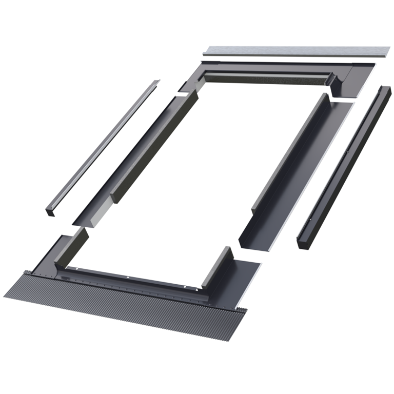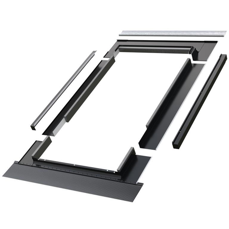 Kołnierz składa się z czterech podstawowych elementów (dolny element, dwa boczne i górny element). Dolny element kołnierza zakończony elastycznym fartuchem o szerokości 165mm posiada podklejoną od spodu masę plastyczną pozwalającą na przyklejenie kołnierza do pokrycia dachowego, przez co zapewniona jest szczelność połączenia. Wyposażony jest ponadto w rynienkę odwadniająca mającą na celu odprowadzenie skroplin pary wodnej z folii wstępnego krycia poza okno.