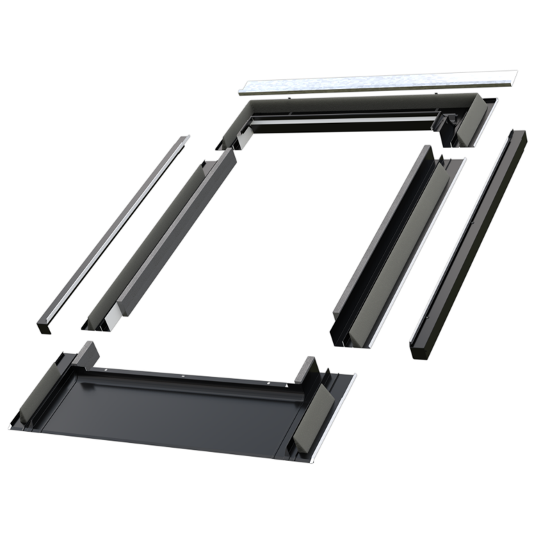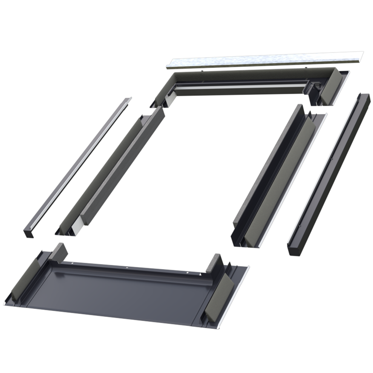 Kołnierz składa się z czterech podstawowych elementów (dolny element, dwa boczne i górny element). Dolny element kołnierza posiada podklejoną od spodu masę plastyczną pozwalającą na przyklejenie kołnierza do pokrycia dachowego. Wyposażony jest ponadto w rynienkę odwadniająca mającą na celu odprowadzenie skroplin pary wodnej z folii wstępnego krycia poza okno.