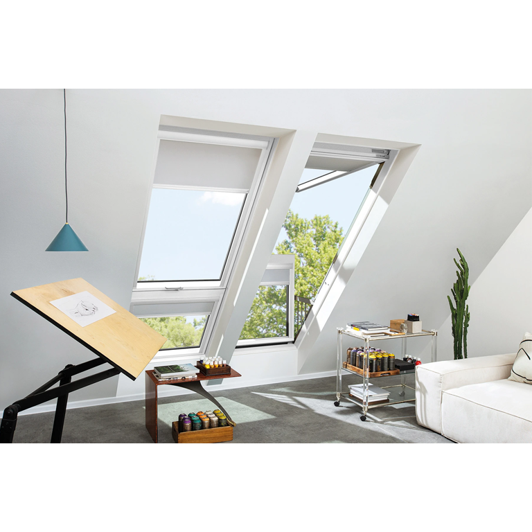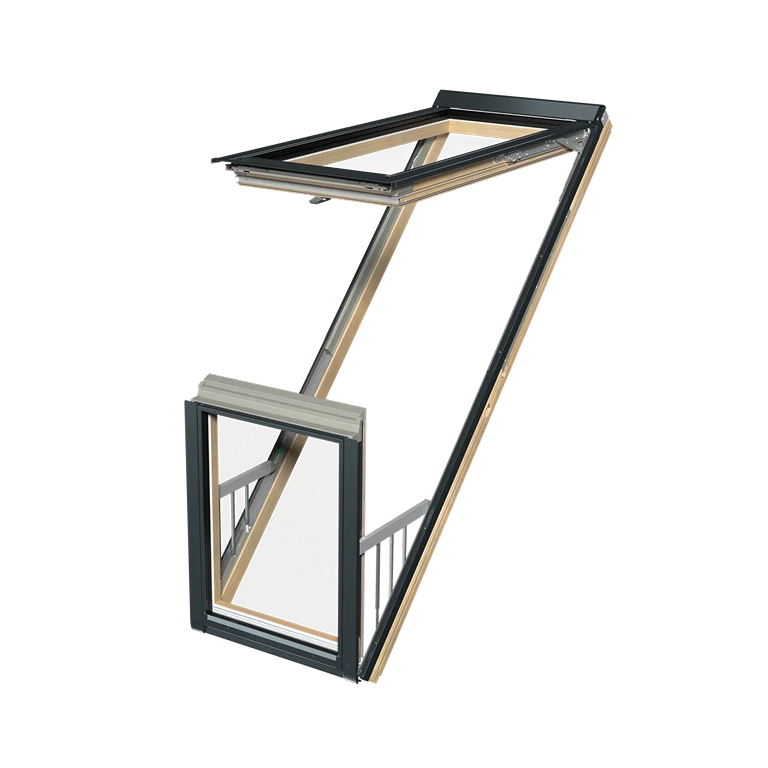 Okna drewniane FGP-V P50 APMX GREENVIEW to nowa generacja nowatorskich, dużych okien dachowych, w którym otwarte skrzydła tworzą balkon. Górne skrzydło otwierane jest uchylnie do góry, a dolne uchylane do przodu umożliwiając swobodny dostęp do wnęki balkonu. Okno posiada współczynniku Uw = 1,1 W/m2K montowane z kołnierzem uszczelniającym w wersji Thermo.