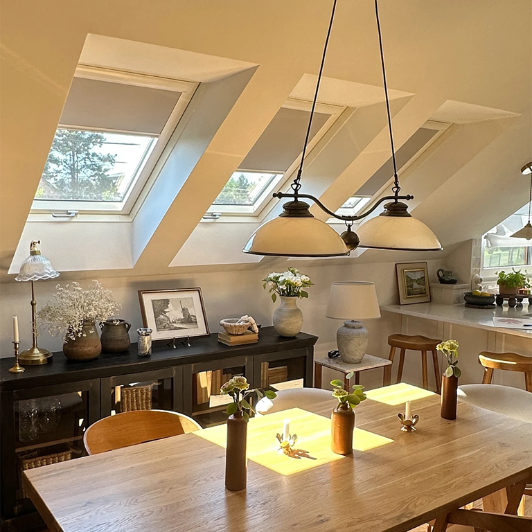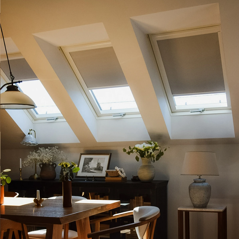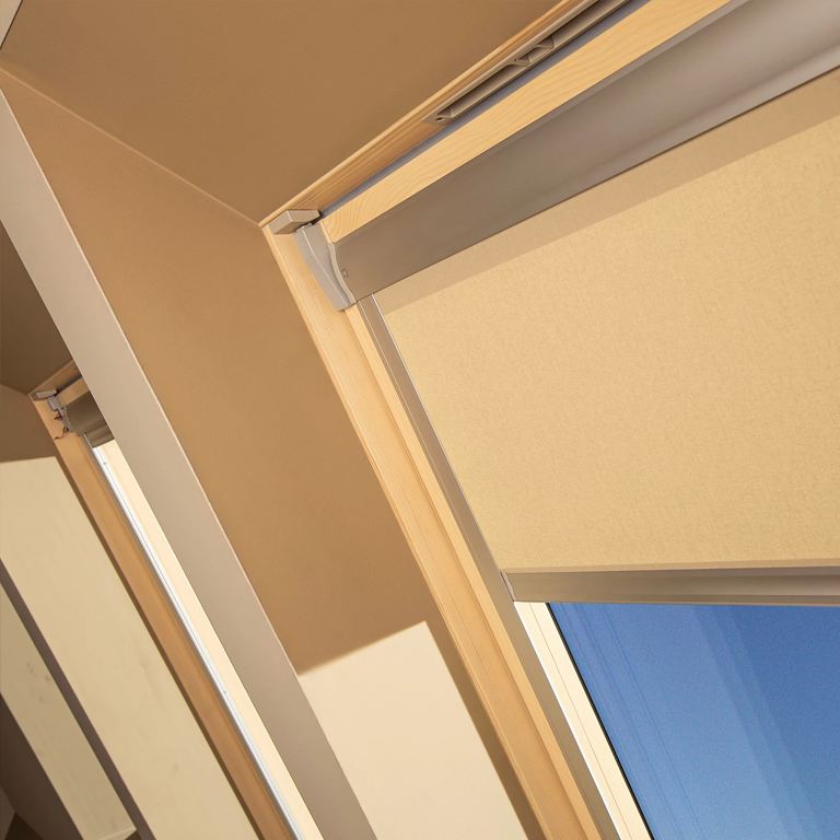 - zapewnia częściowe zaciemnienie, zaciągnięta na oknie dachowym roleta rozprasza ostre światło słoneczne,